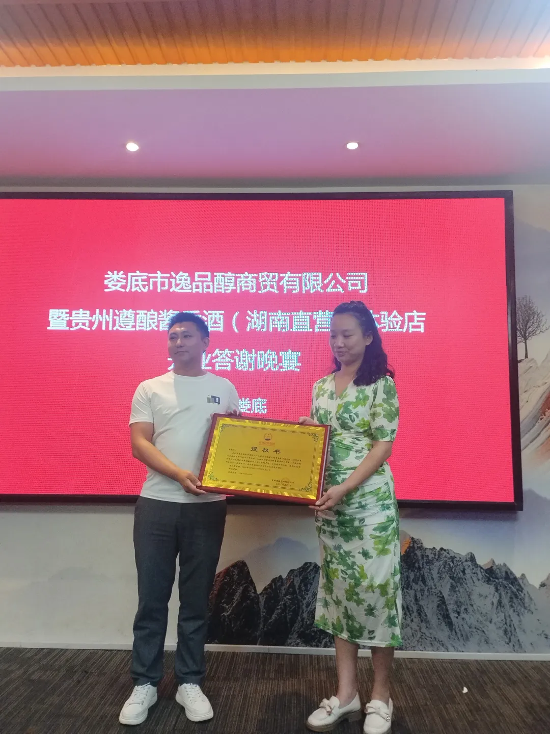 最后,贵州遵酿酒业有限公司总经理何应向娄底市逸品醇商贸有限公司颁发了湖南省独家运营商授权书,逸品醇公司总经理廖湘玉接取了授权书。