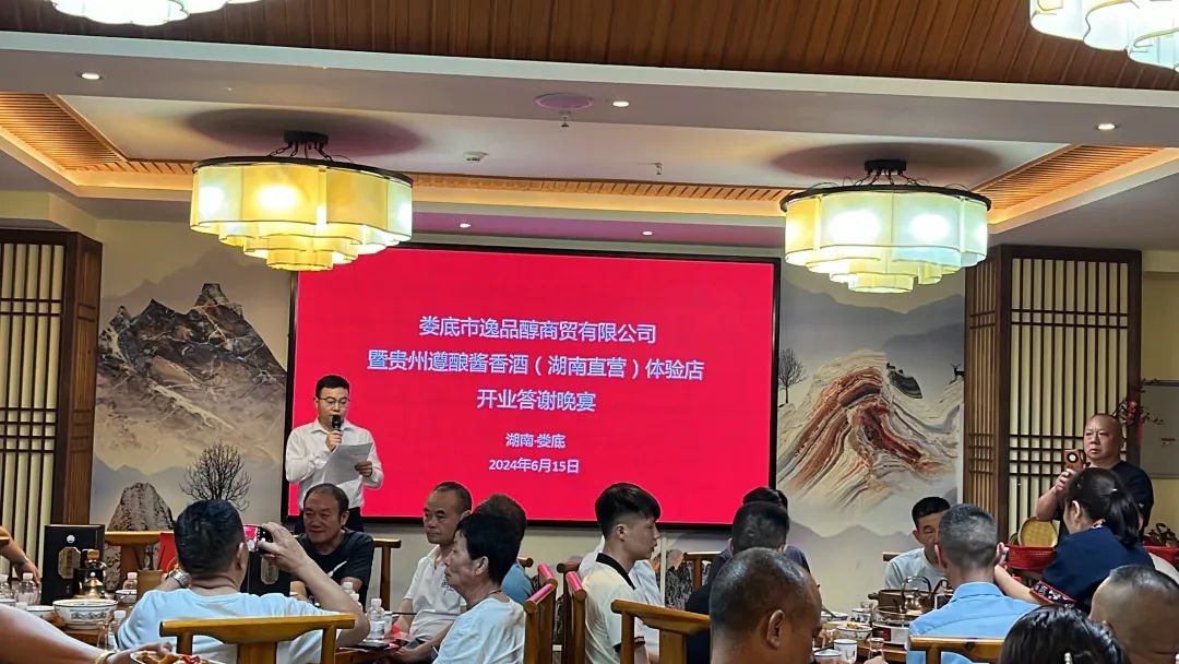 6月15日,贵州遵酿集团有限公司湖南子公司娄底市逸品醇商贸有限公司开业仪式暨答谢晚宴在娄底市娄星区青瓦厨房二楼宴会厅隆重举行,答谢晚宴由集团公司运营总监杨定洪主持,集团公司高层管理团队,贵州遵酿酒业有限公司、贵州遵酿商贸有限公司、贵州遵酿酒文化交流中心、遵义辉章公馆餐饮管理有限公司(筹)、娄底市逸品醇商贸有限公司相关负责人以及特邀嘉宾朋友共计近100人参加了开业仪式及答谢晚宴。